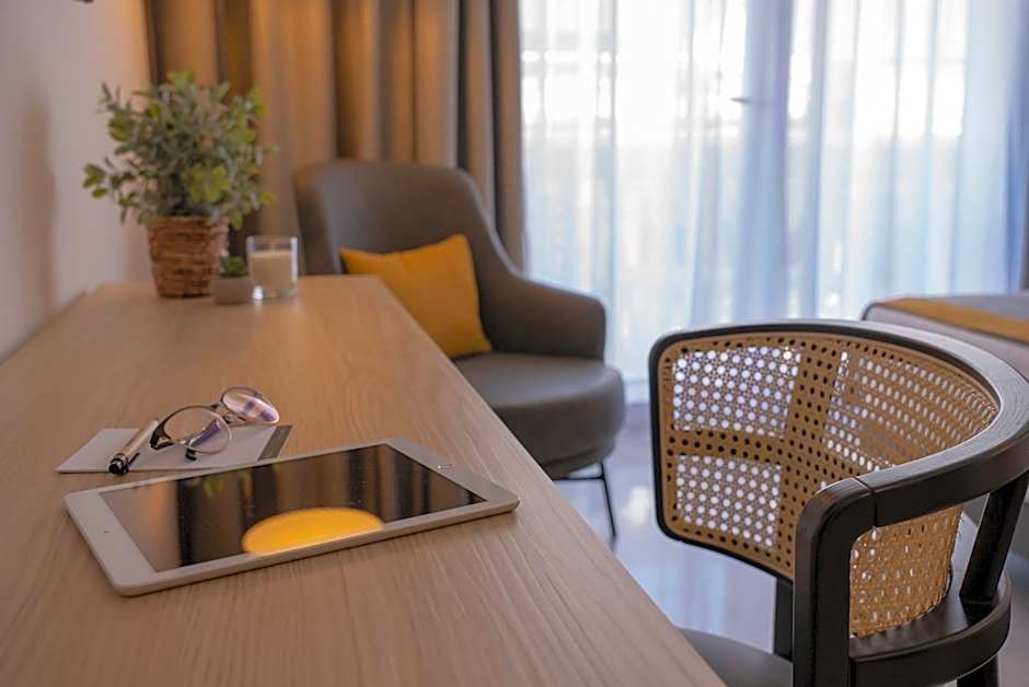 This stylish room features a private furnished balcony with partial sea views. There is a kind size bed and the room comes with a coffee maker.